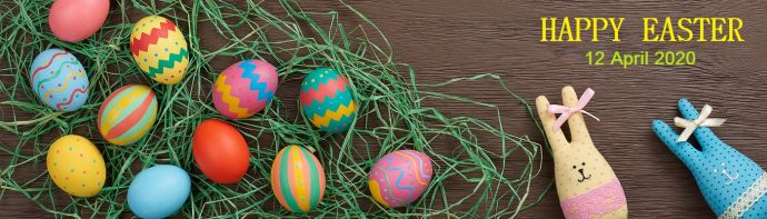 Easter background, eggs, yellow tulips on wood